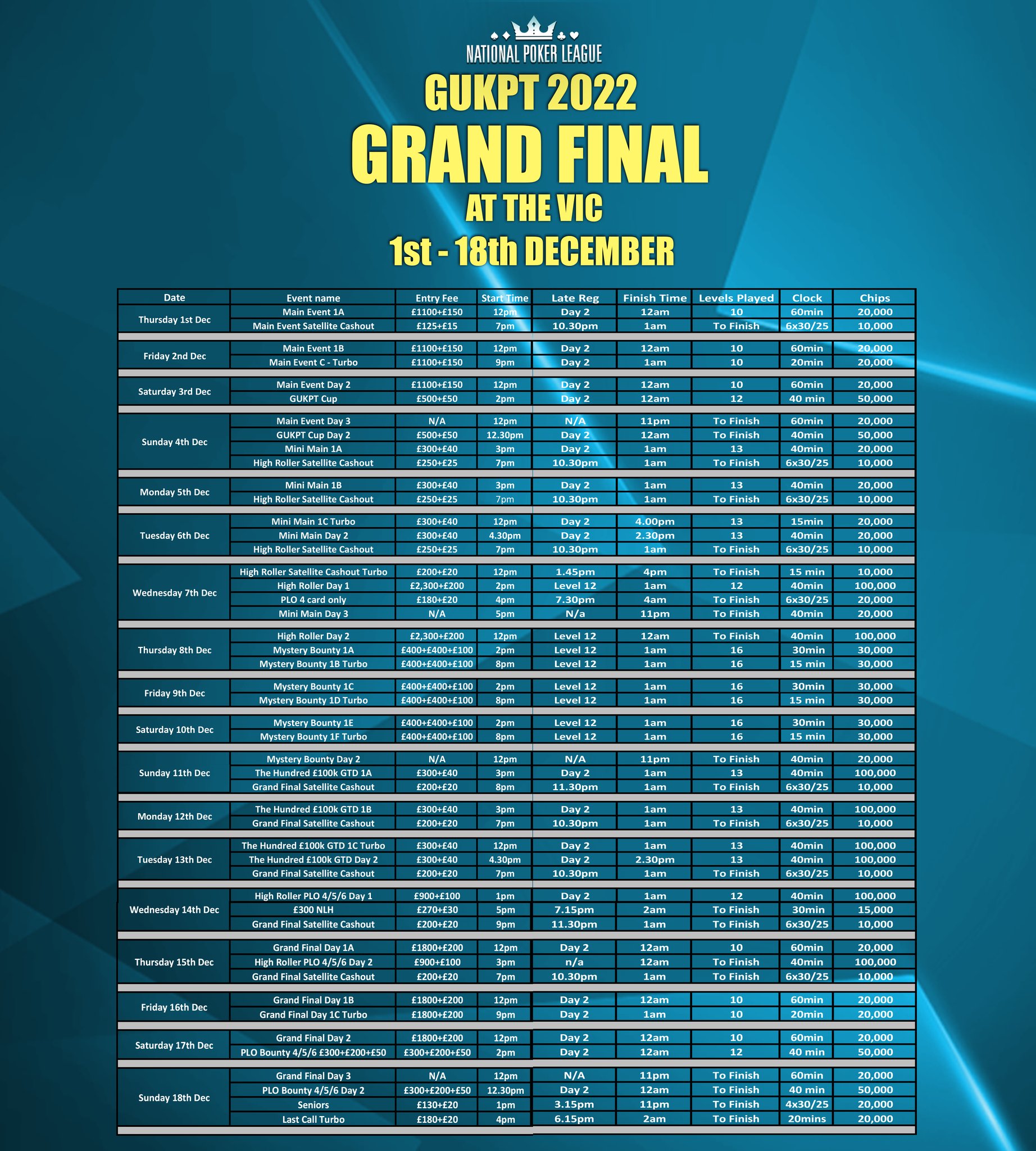 Featuring the £1100 + £150 Main Event GUKPT, the £500 GUKPT Cup, the £300 + £40 GUKPT Mini Main, the £2300 + £200 High Roller, the £400 + £400 + £100 Mystery Bounty, the £300 + £40 The Hundred ‘£100k guaranteed’, the £1800 + £200 GUKPT Grand Final, the £900 + £100 PLO High Roller and much, much more…