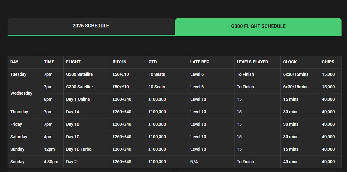New to 2026: a £260+£40 Buy-in with a £100,000 Guarantee. It's the G300.